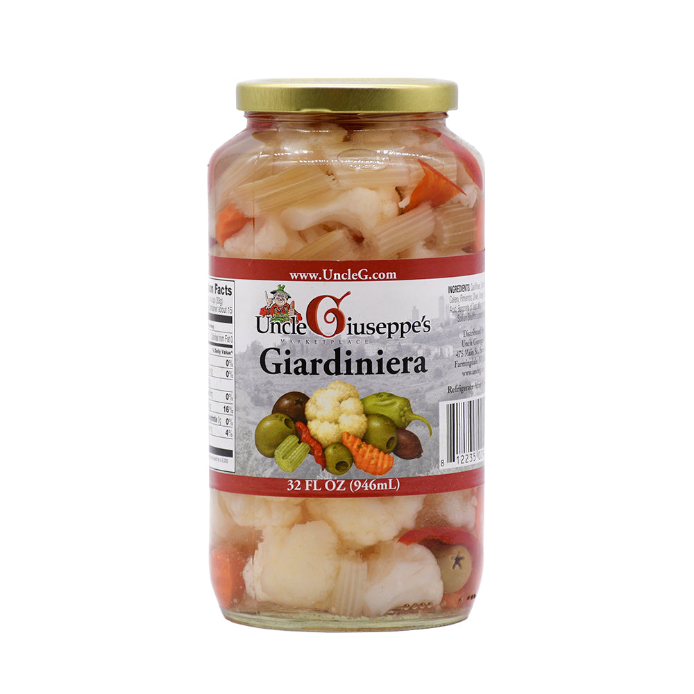 The vegetables in Uncle Giuseppe’s Giardiniera are picked at the peak of ripeness so that they retain their fresh-picked flavor and crunch. Our classic Italian relish is made up of cauliflower, carrots, peppers, celery, pimentos, and olives that are pickled in vinegar and salt, making it a delicious and naturally low fat way to add vegetables into your everyday diet.